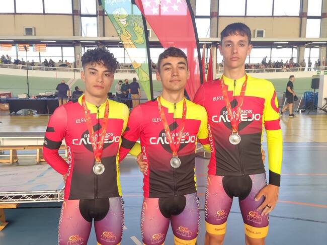 Los integrantes del Recambios Callejo que lograron la medalla de Plata por equipos con Castilla y León en el Nacional juvenil de Pista. Bruno Palomo, Unai Díez y Juan Hermosa, de izq. a dch.