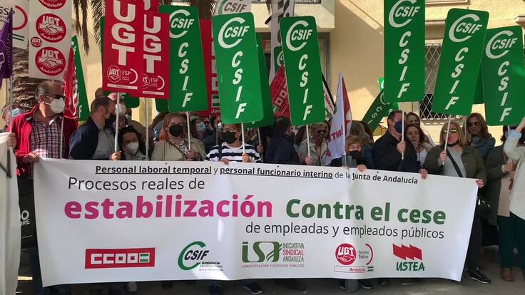 Las organizaciones Comisiones Obreras, UGT, CSIF, USTEA e Iniciativa Sindical Andaluza (ISA) han mostrado hoy unidad sindical en las ocho capitales andaluzas ante la forma en la que la Junta de Andalucía está intentando conseguir y reducir hasta el 8% la temporalidad de sus empleados públicos, porcentaje exigido por la Unión Europea. En Jaén, la protesta ha tenido lugar ante la sede del gobierno regional en la plaza de las Batallas.