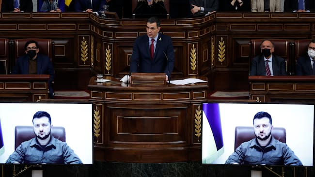 El presidente del Gobierno, Pedro Sánchez (c), interviene tras la intervención por videoconferencia del presidente de Ucrania, Volodímir Zelensky en el pleno del Congreso de los Diputados. / Chema Moya (EFE)