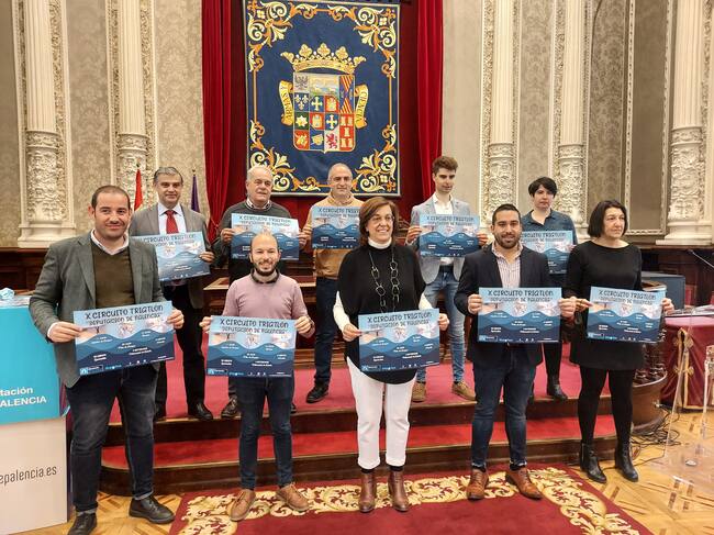 La presidenta de la Diputación, Ángeles Armisén, junto al diputado de Deportes, Francisco Pérez; los alcaldes de los seis municipios integrantes del circuito y los clubes organizadores de las pruebas, ha presentado esta mañana una nueva edición del Circuito de Triatlón Diputación de Palencia.