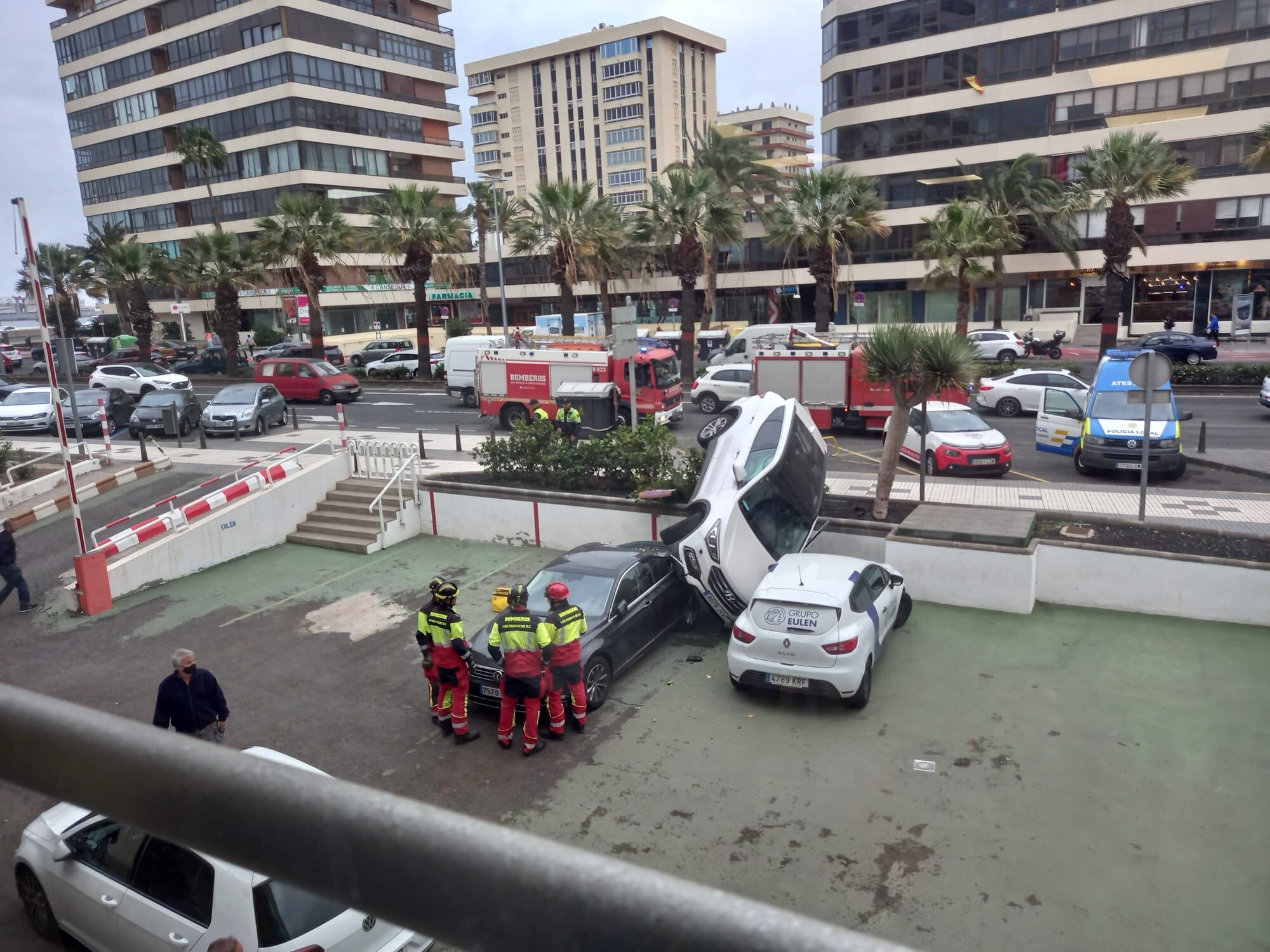 Un espectacular accidente ha sobrecogido a primera hora de la mañana a los vecinos de la céntrica calle Juan XXIII de Las Palmas de Gran Canaria. Una conductora perdió el control de su vehículo saltándose un parterre e impactando sobre un vehículo que se encontraba estacionado en un parking.