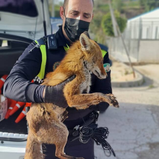 Un policía local de Jaén carga con un zorro herido y desorientado que deambulaba por el casco urbano de la ciudad / Policía Local Jaén