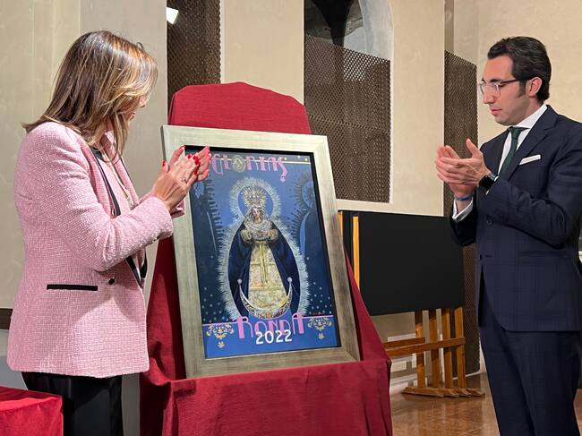 Tras una fantástica presentación del cartel por parte de José Carlos Romero, Hermano Mayor de la Aurora, se desvelaba el cuadro que la artista sevillana explicaba diciendo que “el color transmite y nos hace sentir, es el reflejo del artista y el lenguaje con el que se manifiesta y se expresa su corazón. Azules de amanecida, de Rosario, de Aurora, de romerías, de anochecer en el camino o madrugada, de espera ante las rejas, Rocío. Azules de contraluz que nos dibujan perfiles de ráfagas de devoción de toda una ciudad ante la Paz, que pone blanco color, a este, su año. Azul en esa otra ráfaga perfilada, dónde adivinamos como el niño mira a su madre, Virgen de la Cabeza, cuántos siglos de devoción en la memoria, como azul tu manto aurora con el que cubrirnos para guardarnos, serena calma y dulce luz en tu mirada, Aurora, principio de todo, luz sonrosada, niña que pronto supo de su porvenir y del que vendría por nosotros a morir y que entre sus manos guarda, Jesús hombre salvador. Azules de una noche sobre Ronda, ciudad contenida en su propio nombre, sobre el que lucen estrellas que aluden a la prosperidad a la Gloria y a todos aquellos que ya no están. Cuatro estrellas doradas, cuatro hermandades, cuatro puntos cardinales, glorias exclamadas, glorias anheladas, devociones que alimentan nuestra fe y que reconfortan nuestro corazón mariano con la satisfacción de que él ha Resucitado", concluía ante el aplauso de los asistentes.