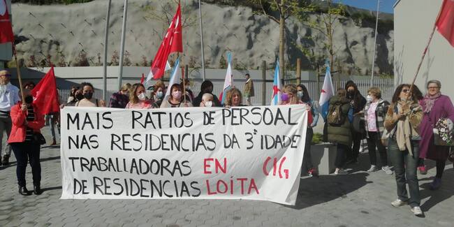 Trabajadores de las residencias privadas para la tercera edad se han concentrado esta mañana a las puertas del edificio Amizar. Denuncian que en las residencias privadas cada enfermera atiende de media a ocho usuarios mientras que en las públicas la cifra baja a 3, afirman desde la CIG.