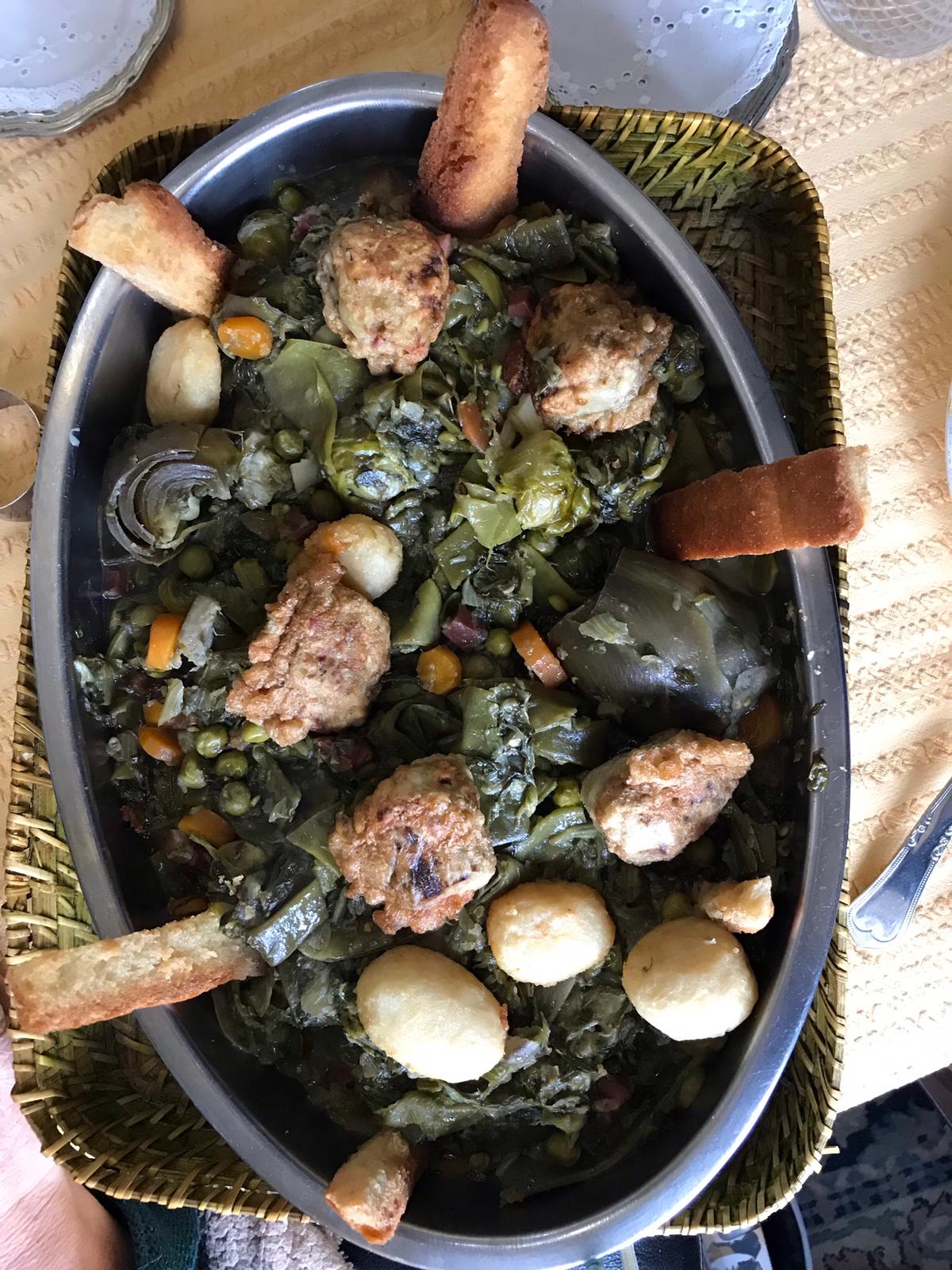 Se corta el jamón en cuadrados y se fríen en el aceite,se saca y se reserva,en el mismo aceite se doran las cebollas reducidas a picadillo fino, se añaden las patatitas peladas y las zanahorias en rodajitas, se revuelven para que se impregnen del aceite y se dejan cocer 5 minutos, se añaden entonces los guisantes, los tirabeques y las judías una vez quitados los hilos y cortadas en tres ,se le da una vuelta para mezclar bien y se deja cocer 5 minutos, se añaden entonces las cabezas de los espárragos, las lechugas cortadas en juliana fina, las coles de Bruselas enteras y las alcachofas previamente cocidas para que no amarguen, se sazona con sal, pimienta y unas gotas de vinagre, se añade el jamón y se deja cocer todo a fuego lento teniendo cuidado de revolver de vez en cuando para que no se pegue, si vemos que no tienen bastante líquido añadiremos un poquito de agua caliente, pero no suele hacer falta.