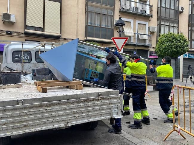 Varios operarios retiran una cabina de teléfono de la capital. / Ayuntamiento de Jaén
