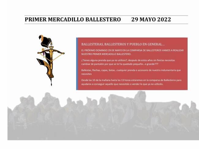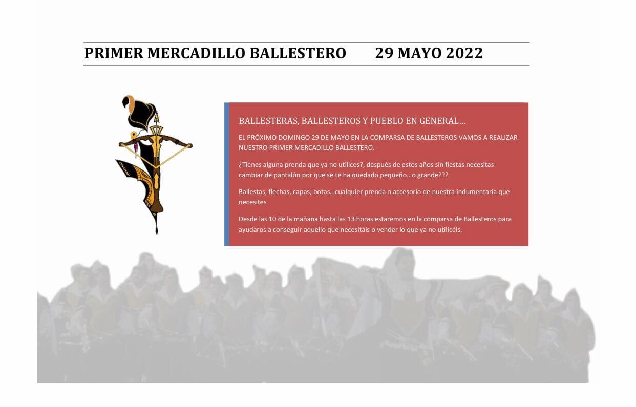 Además, y ya preparando las fiestas que podremos celebrar después de dos años de paréntesis, añadimos el “mercadillo” que realizará el domingo 29 de mayo la Comparsa de Ballesteros, que ha previsto en su local social el facilitar que se puedan vender o comprar aquellos objetos que precisen sus socios y socias de cara a completar o renovar su traje. Este primer mercadillo ballestero se llevará a cabo durante la mañana de ese día