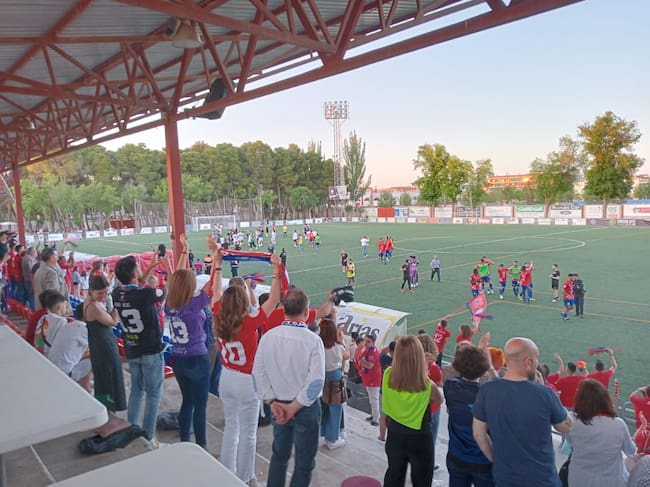 Aficionados del Villarrobledo celebran el triunfo, al fondo jugadores del Illescas / SER Toledo