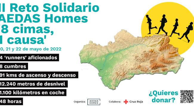 En el I Reto Solidario AEDAS Homes ‘Del mar a la cima del Mulhacén’ a beneficio de la Asociación de Madres y Padres de Niños Oncológicos de Granada (Aúpa) tres ‘runners’ aficionados recorrieron los 105 kilómetros que unen la playa de Motril, el Pico Mulhacén -el techo de la Península- y Granada en 19 horas y 20 minutos consiguiendo fondos y dando una gran visibilidad a esta fundación. El nuevo reto solidario de AEDAS Homes llevará a cuatro deportistas amateurs -entre los que vuelve a encontrarse el Director Territorial de AEDAS Homes en Andalucía y Canarias, Diego Chacón- a coronar las 8 cimas de las 8 provincias andaluzas en 48 horas los días 20, 21 y 22 de mayo. Con esta aventura por los picos más altos de Andalucía, la promotora se une a Cruz Roja en Andalucía para recaudar fondos para el ‘Proyecto de Atención a la Infancia Hospitalizada’ que ya ha llegado a más de 3.000 menores ingresados en nueve hospitales en Andalucía.