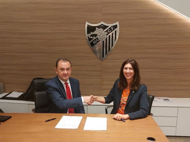 La delegada territorial de Regeneración, Justicia y Administración Local de la Junta en Málaga, Mónica Alejo, y el representante legal de la Fundación, José María Muñoz Jiménez, han firmado este jueves un convenio que facilitará que este tipo de medidas de medio abierto, que no conllevan internamiento de los menores, sean ejecutadas en la entidad del club malagueño.