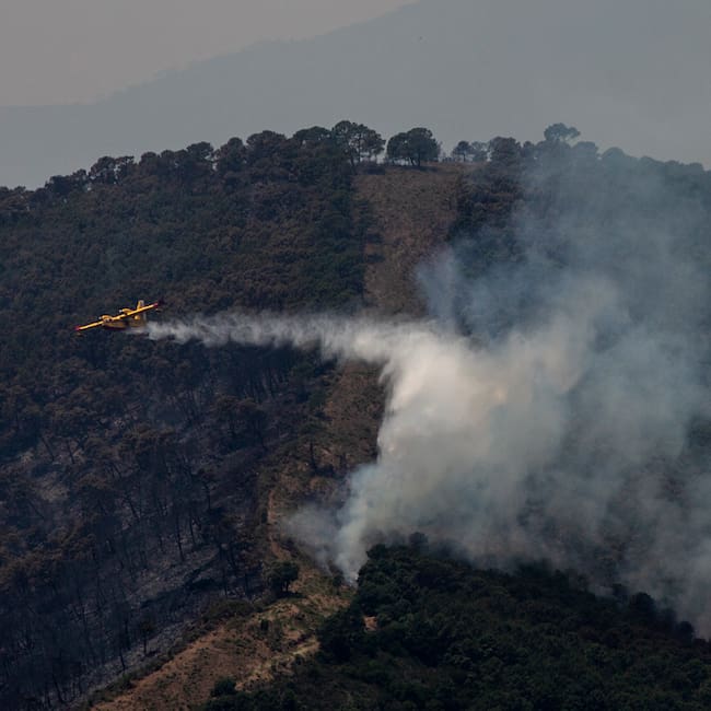 GRAFAND062. BENAHAVÍS (MÁLAGA), 09/06/2022.- Un hidroavión con varios medios aéreos más trabajan en el incendio declarado ayer en Pujerra (Málaga), cercano a Sierra Bermeja, que ha arrasado más de dos mil hectáreas.EFE/Daniel Pérez / Daniel Pérez (EFE)