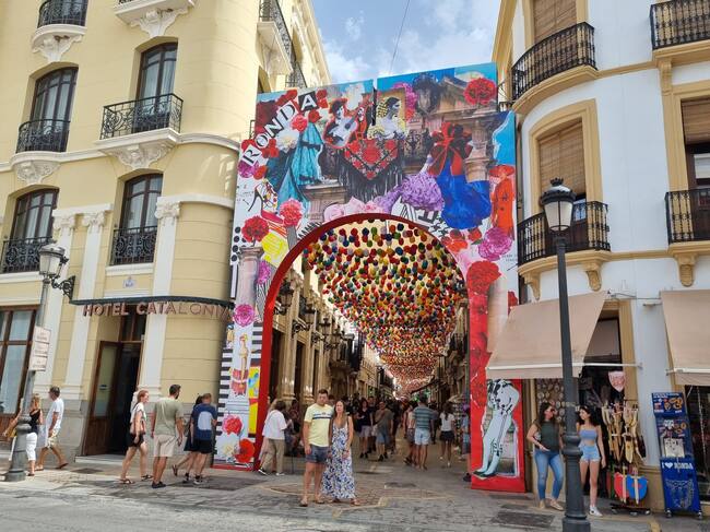 Este fin de semana se ha instalado la portada de la Feria del Centro en su ubicación tradicional, al comienzo de Carrera Espinel. La imagen es obra del diseñador rondeño Javier Jiménez Perdigones.