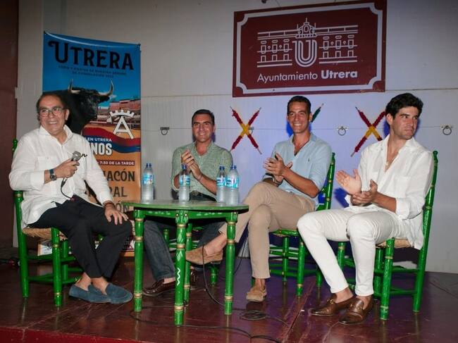 De izquierda a derecha, el periodista Manolo Viera y los diestros Octavio Chacón, Pepe Moral y Alberto López Simón en el acto que protagonizaron el lunes en Utrera / Cadena SER
