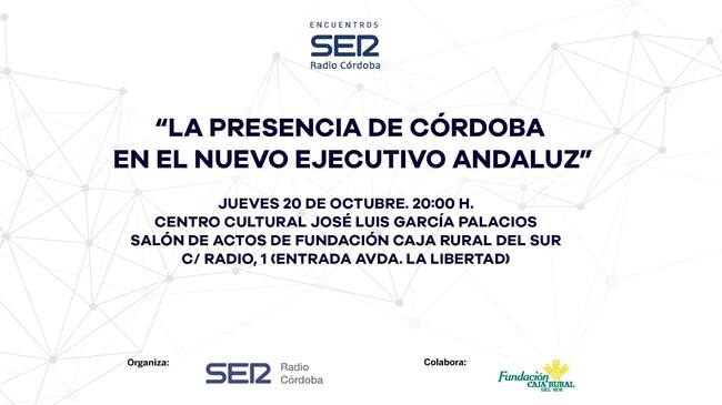 El próximo jueves 20 de octubre, a las 20:00 horas, los consejeros cordobeses en el gobierno de Andalucía explicarán sus retos para la ciudad y la provincia en el encuentro 'La presencia de Córdoba en el nuevo ejecutivo andaluz'.