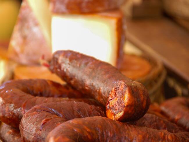 Chorizos ibéricos dispuestos sobre un plato en primer plano, con quesos al fondo sobre una tabla / Xavi Talleda · Photo collection