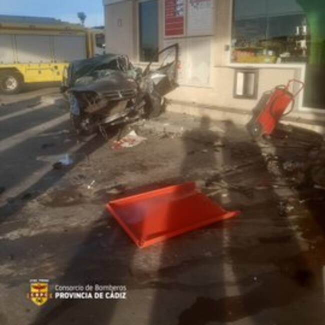 Bomberos del Consorcio Provincial de Cádiz en el parque de Jerez han tenido que intervenir en un accidente de tráfico en el que un conductor que entraba a repostar a una gasolinera acabó empotrando su vehículo contra un pilar de estas instalaciones, cercano a los surtidores, al no frenar a tiempo.