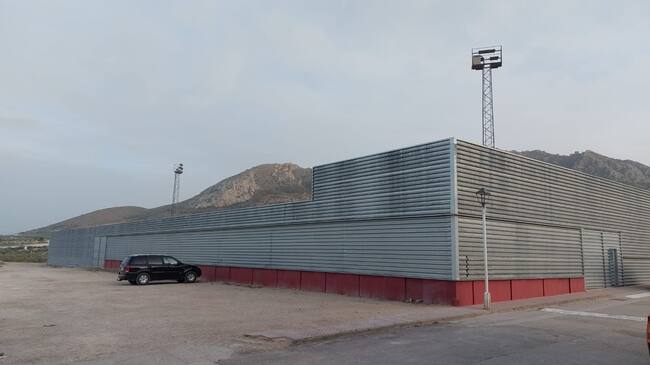 Exterior del Campo Municipal de los Deportes 'Francisco Herrera Cueva' de Jódar, con dos de las torretas de iluminación sobre las que se va a actuar / Antonio Plaza