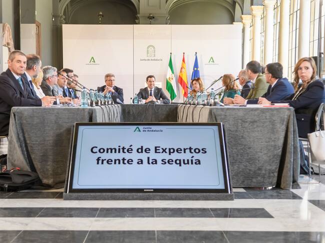 SEVILLA, 18/04/2023.- El presidente de la Junta de Andalucía, Juanma Moreno (c), durante la reunión del Comité de Expertos frente a la sequía, que ha tenido lugar este martes en el Palacio de San Telmo en Sevilla, tras la cuál ha anunciado que e Gobierno andaluz aprobará la próxima semana un tercer decreto contra la sequía con actuaciones por valor de 163 millones de euros, de los que más de 40 irán destinados a medidas de ayuda al sector agroalimentario, que sufre este problema "de manera determinante".EFE/ Raúl Caro. / Raul Caro (EFE)