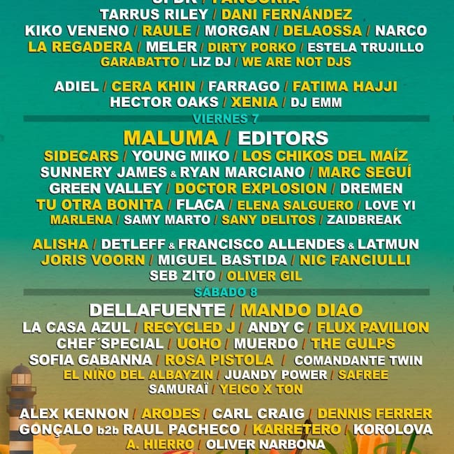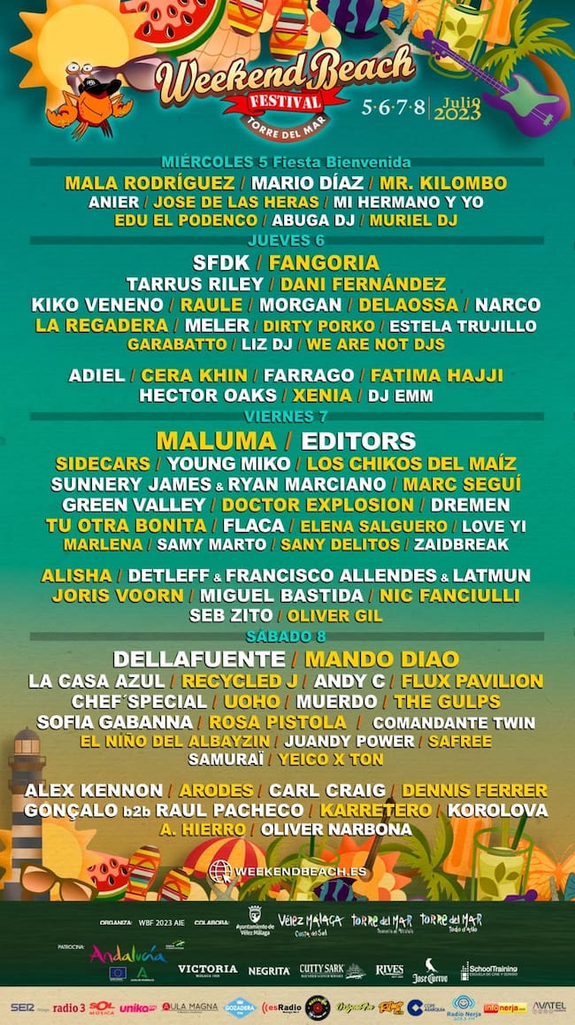 Weekend Beach Festival Torre del Mar, que se celebrará del 5 al 8 de julio de 2023 en una de las playas con más calidad medio ambiental, accesible y más atractivas de la costa de Málaga, tiene un cartel imponente con importantes artistas internacionales y nacionales como MALUMA, EDITORS, CARL CRAIG, DELLAFUENTE, SFDK, FANGORIA, SIDECARS, JORIS VOORN, LA CASA AZUL, CHEF´SPECIALS, HECTOR OAKS, TARRUS RILEY, MALA RODRIGUEZ, KIKO VENENO, DANI FERNÁNDEZ, MORGAN, RAULE, SUNNERY JAME & RYAN MARCIANO, CERA KHIN, FATIMA HAJJI, DELAOSSA, FARRAGO, MARC SEGUÍ, ALEX KENNON, ROSA PISTOLA, MUERDO, DOCTOR EXPLOSION, MIGUEL BASTIDA, NARCO, THE GULPS, DREMEN, LA REGADERA y muchos más.