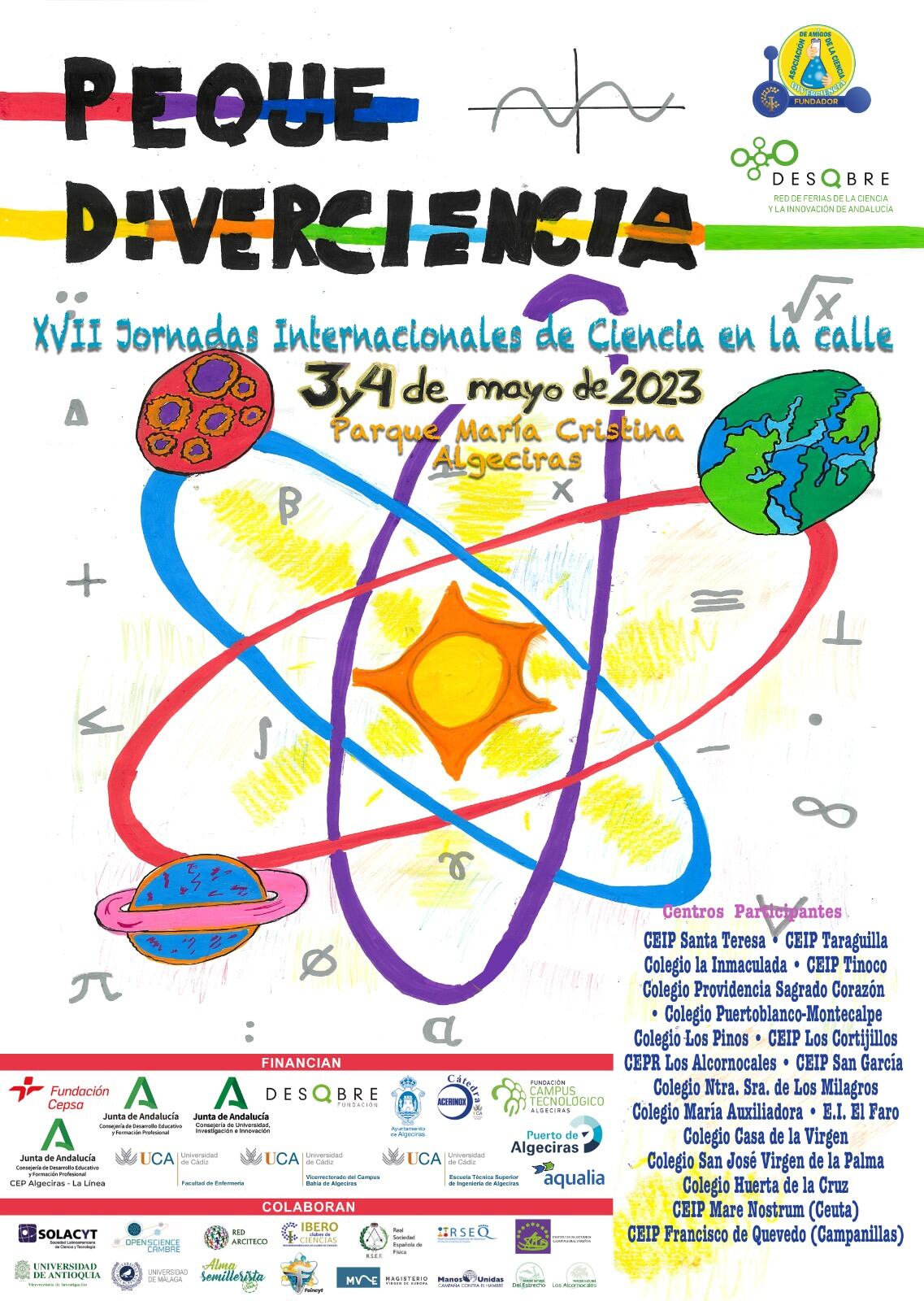 Además, suma en 2023 la colaboración de la Sociedad Latina para la Ciencia y la Tecnología (Solacyt, México) la Red Arciteco (Argentina), la Universidad de Antioquía y los Semilleros de Investigación (Colombia), Feincyt (México), la Open Science de Cambre (A Coruña), la Universidad de Málaga, la Facultad de Magisterio Virgen de Europa, Manos Unidas, el Grupo Especializado de Didáctica e Historia de la Física y la Química perteneciente a la Real Sociedad Española de Física y a la Real Sociedad Española de Química, además del Instituto de Estudios Campogibraltareños (IECG) y los Parques Naturales del Estrecho y Alcornocales.