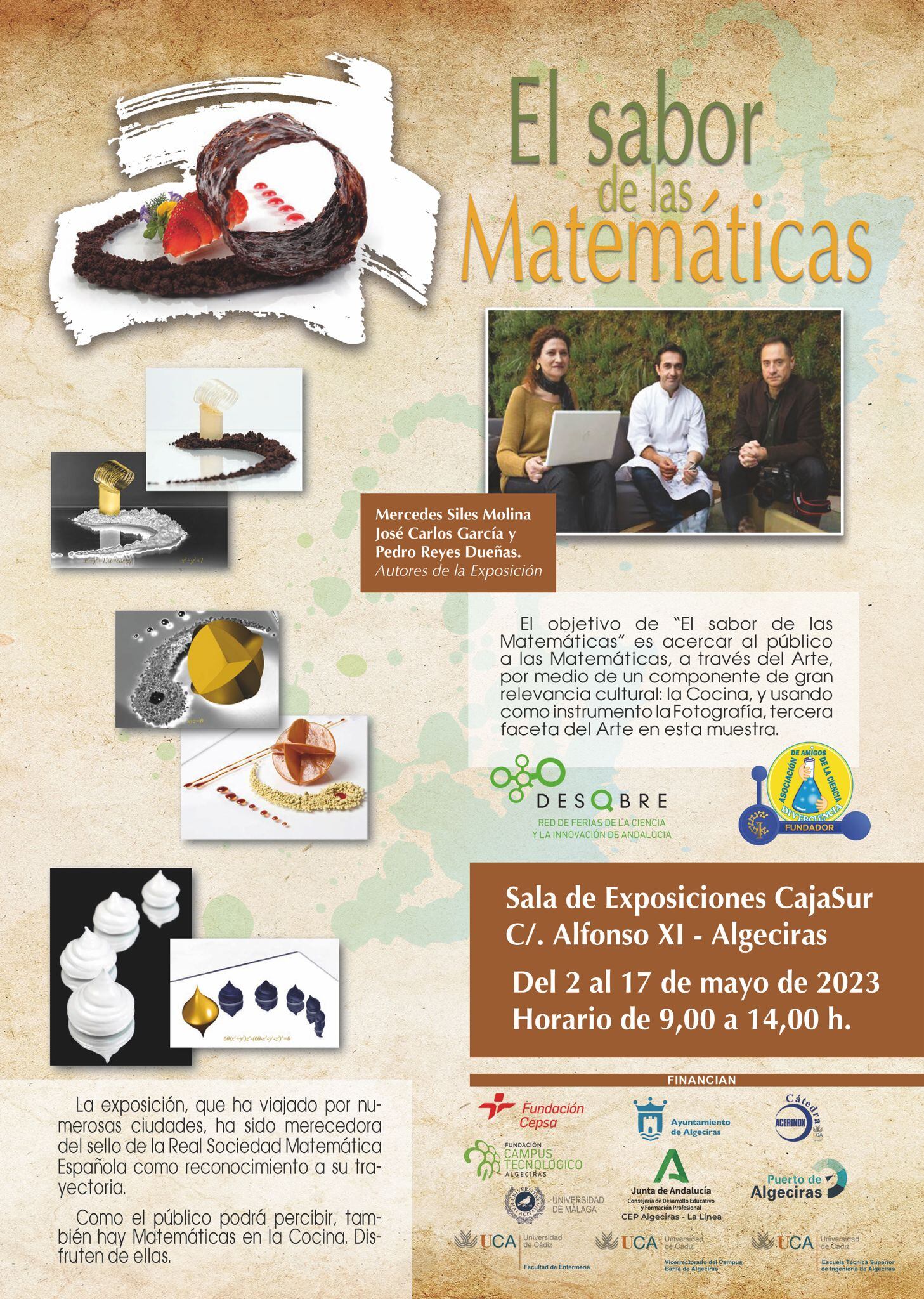 A ello hay que sumar dos exposiciones. La primera de ellas será la undécima edición de la muestra fotográfica ‘Una mirada a la naturaleza: Recursos Naturales del Parque de los Alcornocales’, que se celebra del 2 al 17 de mayo, con fotografías de Erasmo Fenoy, en el Centro Documental José Luis Cano. Por último, la exposición ‘El sabor de las Matemáticas’, a cargo de Mercedes Siles, José Carlos García y Pedro Reyes, cierra el programa de actividades del 2 al 17 mayo en la Sala de Exposiciones CajaSur. La muestra tiene como objetivo acercar al público las matemáticas a través del arte por medio de la cocina y la fotografía.