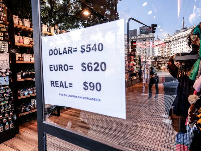 AME4427. BUENOS AIRES (ARGENTINA), 26/04/2023.- Fotografía de un cartel con la cotización de las divisas hoy, en una tienda de Buenos Aires (Argentina). Angustia, ausencia de precios y falta de mercancías en establecimientos se generalizan en Argentina debido al alza de los tipos de cambio paralelos, en una población acostumbrada a seguir el 'dólar blue' (mercado negro) por las fuertes restricciones que aplica el Gobierno para acceder al oficial. EFE/ Juan Ignacio Roncoroni / Juan Ignacio Roncoroni (EFE)