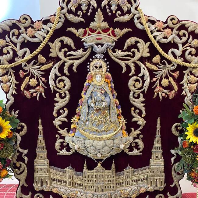 Simpecado de la Hermandad del Rocío de Sevilla Sur con la Plaza de España y sus torres bajo la imagen de la Blanca Paloma / Cadena SER