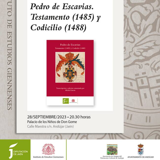El Instituto de Estudios Giennenses, en colaboración con el Ayuntamiento de Andújar y la Asociación Amigos del Patrimonio Cultural de la Andújar, presentan este jueves el libro 'Pedro de Escavias. Testamento y codicilio'. El acto se llevará a cabo a las 20.30 horas en el Palacio de los Niños de Don Gome.