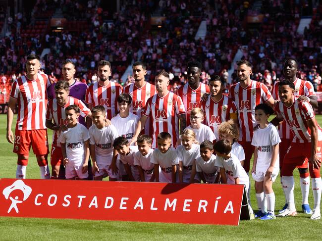 El segundo once del Almería de Gaizka Garitamo rodeado de niños luciendo la camiseta con el logo de Power Horse, patrocinador del club. / Juan Sánchez