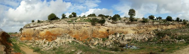 Como puede observarse en el último tramo de nuestro paseo, cuando dejamos a la derecha los farallones de la cantera, en las capas más altas y superficiales que coronan estos cantiles rocosos, afloran calizas y margas blancas que, a modo de cornisa rocosa, pueden verse en la parte superior de los estratos blanquecinos que despuntan sobre las primeras construcciones adosadas a los taludes.