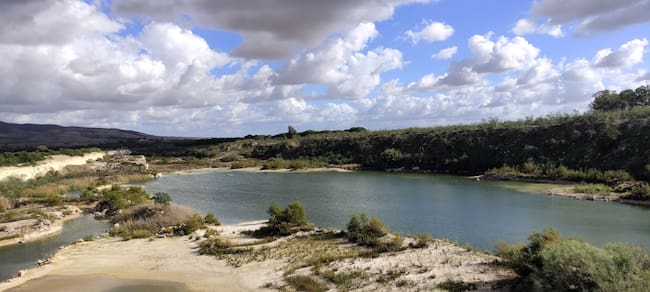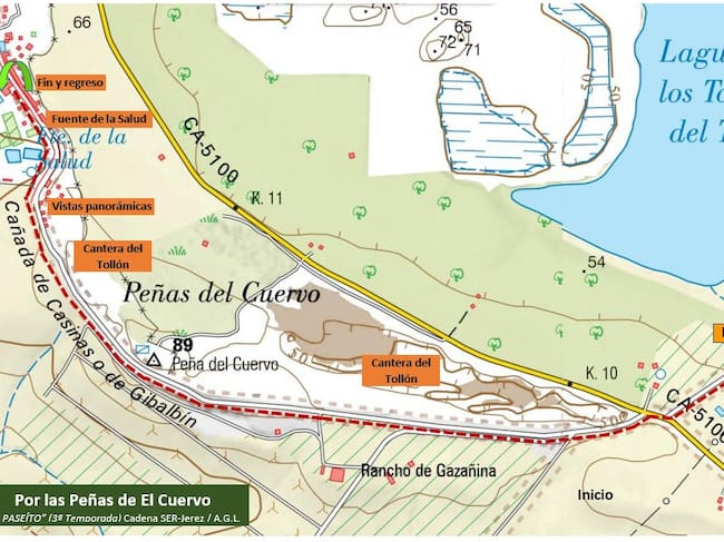 -La Cañada inicia al poco una ligera cuesta ascendente hasta llegar al punto más alto del paraje conocido como Peñas del Cuervo, donde veremos, a la derecha, los depósitos de abastecimiento de agua potable. En este trayecto quedará a nuestra derecha la entrada a un antiguo vertedero de inertes que nos permitirá obtener vistas sobre las pequeñas lagunas formadas en los fosos de la cantera.