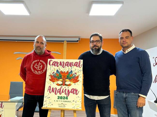 El concejal de Festejos del Ayuntamiento de Andújar, Antonio Torres, ha presentado el cartel y la programación del Carnaval 2024 junto a los representantes de la Asociación Carnavalesca "Pitos Pitos", Manuel Lara y Emilio de la Cruz. Esta celebración tendrá lugar durante los próximos días 9, 10 y 11 de febrero.