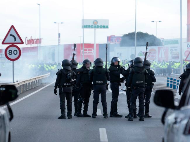 GRAFAND9131. LOS BARRIOS (CÁDIZ), 23/02/2024.- Antidisturbios durante el corte tráfico que han efectuado rabajadores de Acerinox este viernes en la autovía A7 a la altura del polígono de Palmones en Los Barrios (Cádiz), que ha concluido con cargas policiales con gases lacrimógenos y pelotas de goma. Acerinox Europa ha reiterado su voluntad negociadora en relación al cuarto convenio colectivo de la planta de Los Barrios (Cádiz) cuando se cumplen 19 días de la huelga indefinida en la factoría. EFE/A.Carrasco Ragel. / A.Carrasco Ragel (EFE)