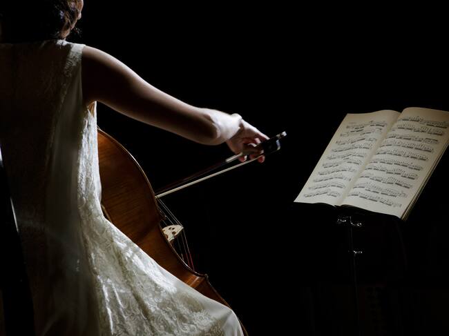 Una mujer chelista tocando delante de una partitura / sot