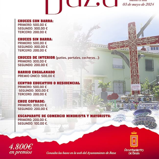 Baza se prepara para celebrar por todo lo alto la fiesta del Día de la Cruz, que desde hace años se recibe con notable expectación y participación. En esta ocasión las cruces tomarán protagonismo durante los días 3, 4 y 5 de mayo, viernes, sábado y domingo, y para que todo funcione de la mejor manera ya se ha aprobado la normativa municipal que determinará las circunstancias que deberán respetarse en su instalación y desarrollo, así como las bases que van a regular el tradicional concurso de engalanamiento. El plazo para solicitar la instalación de una Cruz de mayo en Baza finalizará el viernes 19 de abril, debiendo realizarse en el registro de entrada del Ayuntamiento o a través de su sede electrónica.