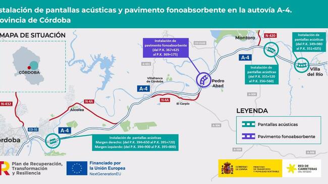 En Pedro Abad, entre los p.k. 367,625 y 369,175, se procederá a la sustitución del pavimento existente por un pavimento fonoabsorbente. Por último, en Córdoba capital, entre los p.k. 394,650 y 395,720 y los p.k. 394,900 y 395,800, se instalarán pantallas acústicas.