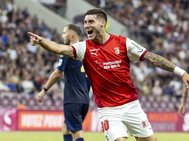 Geneva (Switzerland Schweiz Suisse), 15/08/2024.- Braga's forward Roberto Fernandez celebrates his goal after scoring the 0:2, during the UEFA Europa League 3rd qualifying round second leg soccer match between Switzerland's Servette FC and Portugal's SC Braga, at the Stade de Geneve stadium, in Geneva, Switzerland, 15 August 2024. (Suiza, Ginebra) EFE/EPA/SALVATORE DI NOLFI / SALVATORE DI NOLFI (EFE)