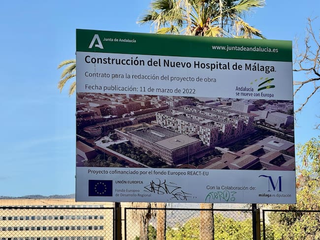 Cartel que anuncia el futuro hospital junto al Civil de Málaga / Cadena SER