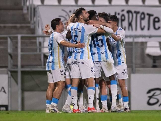 El Málaga celebrando el primero gol del partido conseguido por Roko Baturina