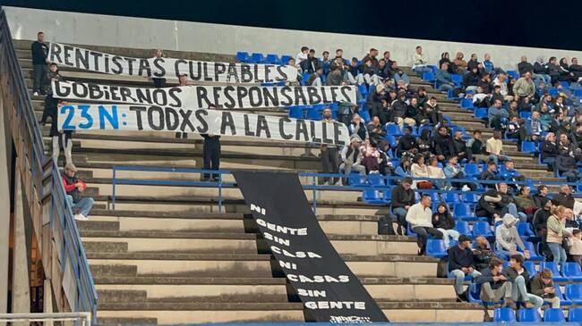 Para anunciar esta convocatoria, el pasado sábado miembros de este colectivo desplegaron una pancarta en el estadio Pedro Garrido bajo el lema "Rentistas culpables, gobiernos responsables".