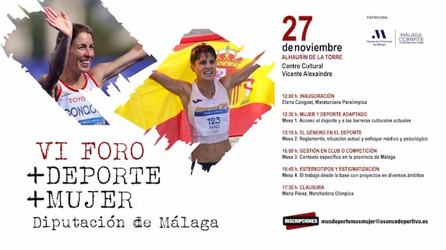 La marchadora granadina María Pérez y la maratoniana catalana Elena Congost, forman parte del amplio programa que abordará este miércoles desde cuatro prismas diferentes la realidad del deporte femenino en el VI Foro Más Deporte, Más Mujer Diputación Provincial de Málaga, en un acto que se llevará a cabo en una única jornada en el Centro Cultural Vicente Aleixandre de Alhaurín de la Torre (Málaga).