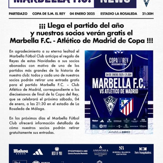 Los socios del Marbella podrán retirar una entrada gratis para presenciar el partido de los dieciseisavos de final de la Copa del Rey ante el Atlético de Madrid, que se disputará el próximo 4 de enero en el estadio de La Rosaleda a las 21:30 horas.
