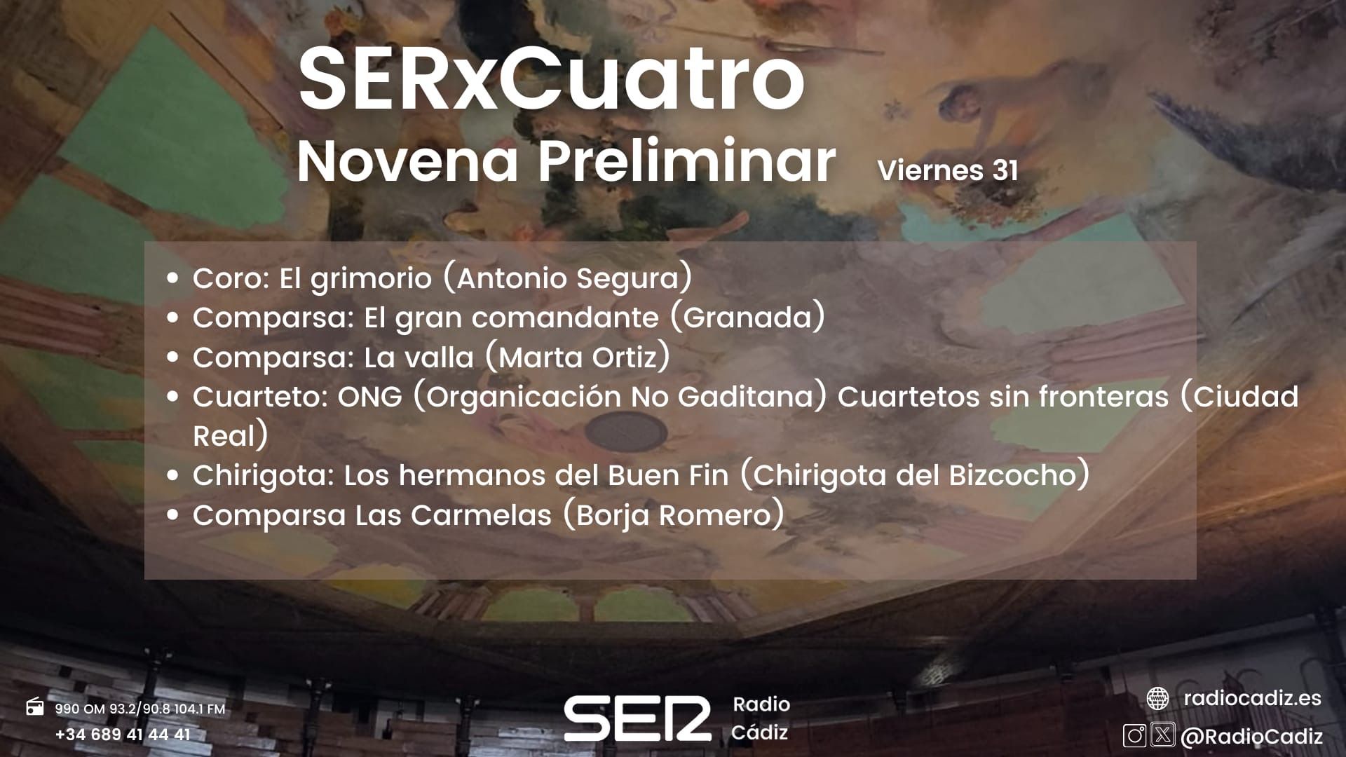 Ayer fue turno de la novena preliminar de este COAC. Antes de que llegase febrero, el mes más esperado del gaditano, el Concurso Oficial de Agrupaciones Carnavalescas (2025) va siguiendo su curso. La noche de jueves de Preliminares, algo descafeinada, destacó porque los 'Payasos' de Nene Cheza y 'La Majadería' dirigidas por Palmi Santander pusieron el toque desenfadado y un poco de locura en el Gran Teatro Falla. Por ello, ayer llegó la chirigota de Antonio Álvarez 'Bizcocho', quien estuvo en el reaccionando de SERxCuatro en el día de ayer.
