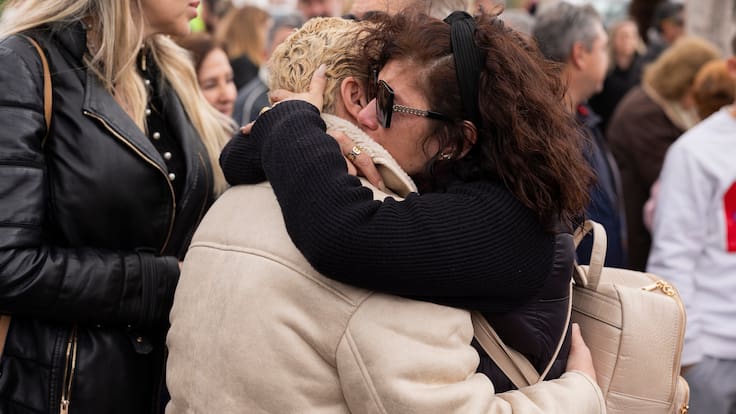 Dos mujeres se abrazan tras el minuto de silencio en la concentración espontánea de vecinos de Benalmádena, donde esta madrugada un hombre presuntamente ha matado a su pareja en presencia de sus hijos. / EFE/Carlos Díaz.