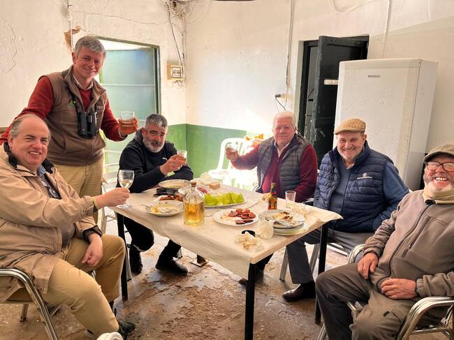 La media de edad de la reunión supera de largo los sesenta, pero nadie el feo ni al vino ni a las viandas. Excelente morcilla de hígado de la Venta El Cotito, de Mesas de Asta, aunque el chorizo y los chicharrones no se quedan atrás. Tampoco el jamón serrano que parece cortado por un carnicero con el grosor de una chuleta, pero qué bien le va al pan de campo de allí mismo, en el pueblo. Una fuente con hermosa hojas de lechuga de la zona ocupa en centro de la mesa. Tiene sólo el aliño del vinagre, pero es suficiente. El crujiente y el frescor hacen el resto.