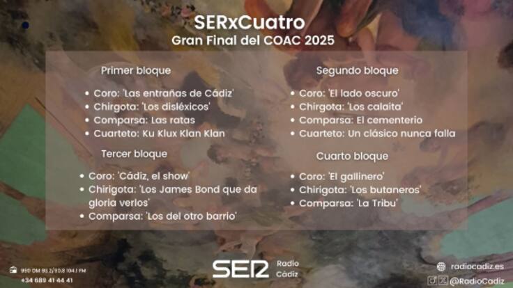 Dividida en cuatro bloques, en el primero tendremos cuatro agrupaciones, donde abrirá el coro de David Fernández y Pedrosa, 'Las entrañas de Cádiz'. Además, en los dos primeros, se encuentran los dos únicos cuartetos de esta final: 'Ku Klux Klan Klan', de Gago y Miguel moreno, y 'Un clásico nunca falla', de Iván Romero.