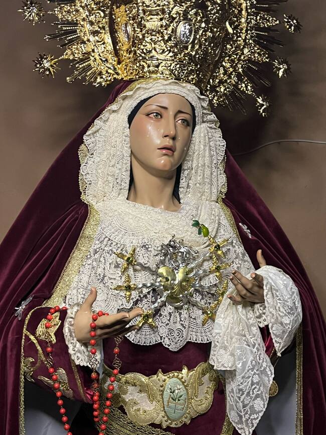 Con una expresión de serena tristeza, de su rostro sobresale la mirada perdida y algo infinita a través de unos sujestivos ojos pintados de color verde y sus mejillas surcadas por siete lágrimas, símbolo de los Siete Dolores de la Virgen, en clara referencia a su papel en la Pasión de Cristo.