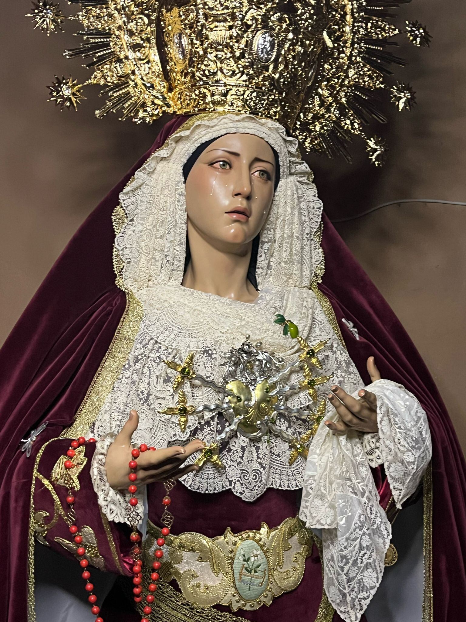 Con una expresión de serena tristeza, de su rostro sobresale la mirada perdida y algo infinita a través de unos sujestivos ojos pintados de color verde y sus mejillas surcadas por siete lágrimas, símbolo de los Siete Dolores de la Virgen, en clara referencia a su papel en la Pasión de Cristo.