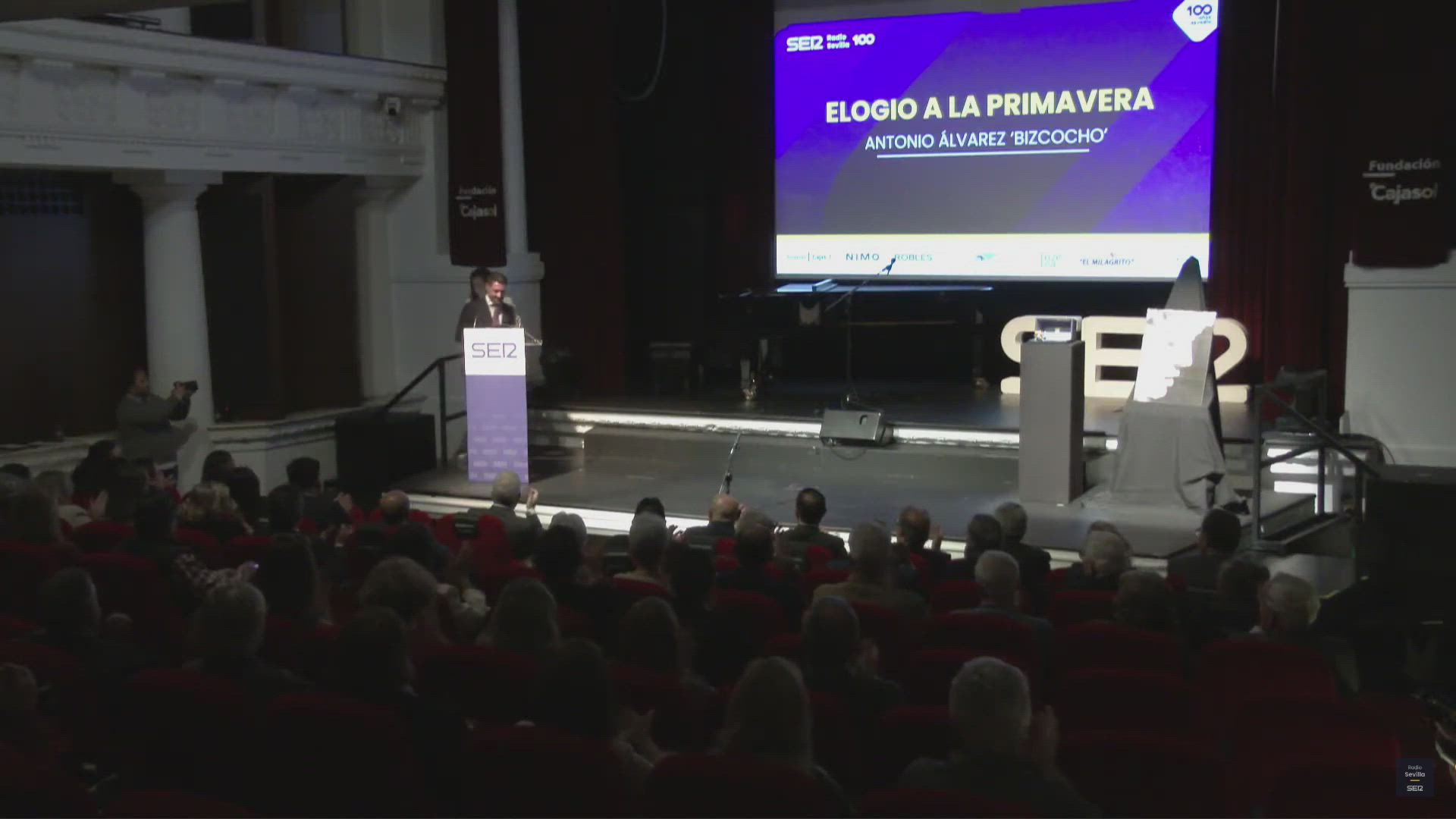 Después, ha tomado la palabra Antonio Álvarez "El Bizcocho", que ha pronunciado su 'Elogio a la Primavera'. Un Elogio que ha comenzado felicitando también a Radio Sevilla por su centenario, y mostrándose orgulloso por el trabajo de sus compañeros. En la primera parte del elogio, ha desmontado los prejuicios que se tienen del sur y tras ello ha recitado una poesía repasando las principales tradiciones primaverales de la ciudad. Se ha acordado de su predecesor, Julio Muñoz, quien elogiara la primavera el pasado año, y ha recordado una divertida anécdota de su primera salida como nazareno en su hermandad de El Baratillo, para después recitar otra poesía en la que ha relatado la entrada de la cofradía en su templo en la noche del Miércoles Santo.