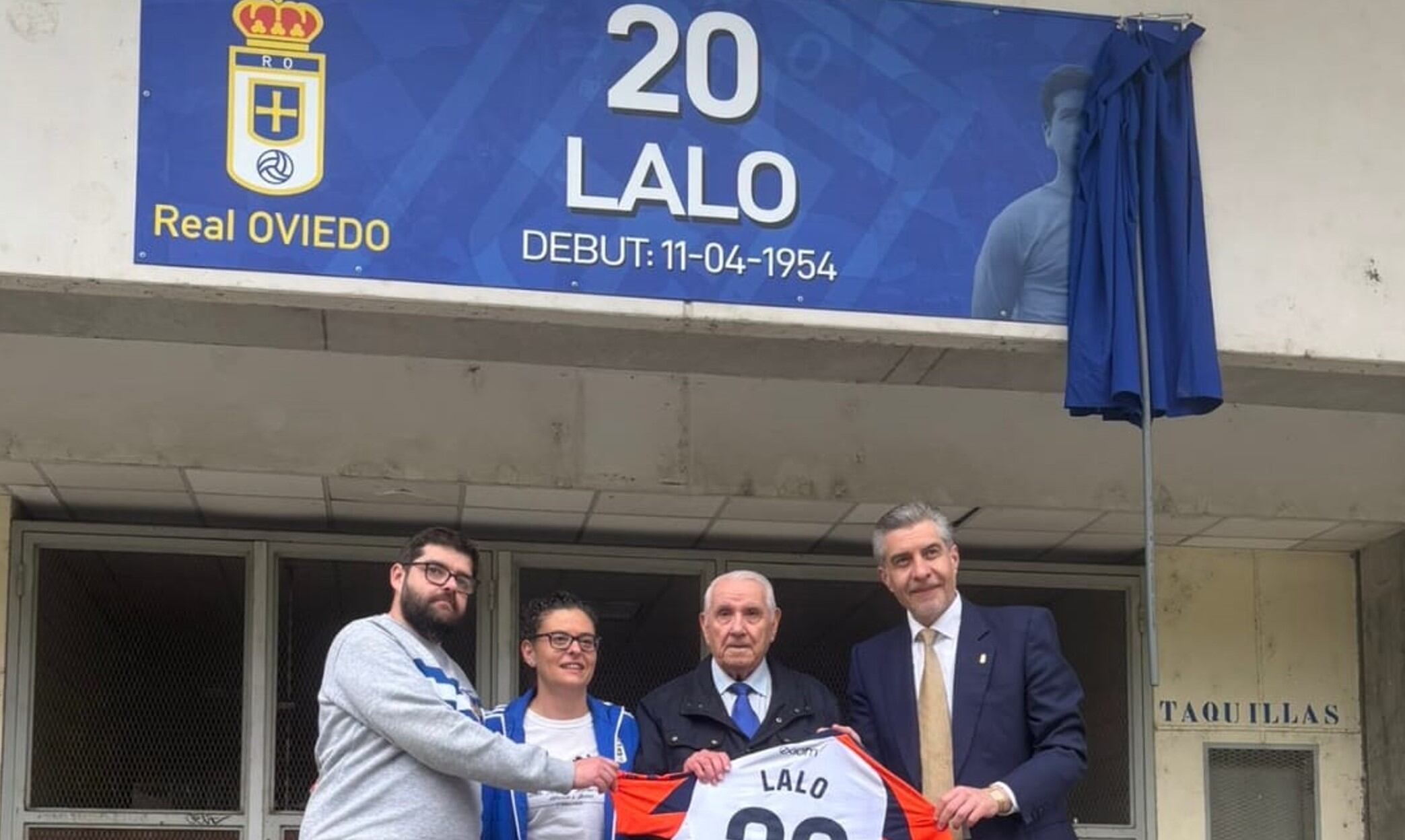Pasan los años para todos, pero de una forma muy especial para don Eduardo Gómez, Lalo, que a su amor por el real Oviedo se ha unido el bautismo de una puerta que lleva su nombre. Por la número 3 a partir de ahora pasarán los aficionados del equipo carbayón, recordando a un futbolista irrepetible y a un entrenador (que dando la vuelta a España) se confiesa profundo seguidor del equipo azul. Siempre fiel a sus colores, para los aficionados más jóvenes hubo que dar detalles de toda la grandeza del entrenador asturiano, mientras que los mayores saben de sobra la vida y la obra de Lalo que ha quedado inmortalizado para siempre en la puerta de uno de los campos más bellos de España. Si hace unos días cumplía 90 años con la camiseta del Real Oviedo, su familia siente con orgullo el detalle del club asturiano al ponerle su nombre a la puerta número tres.